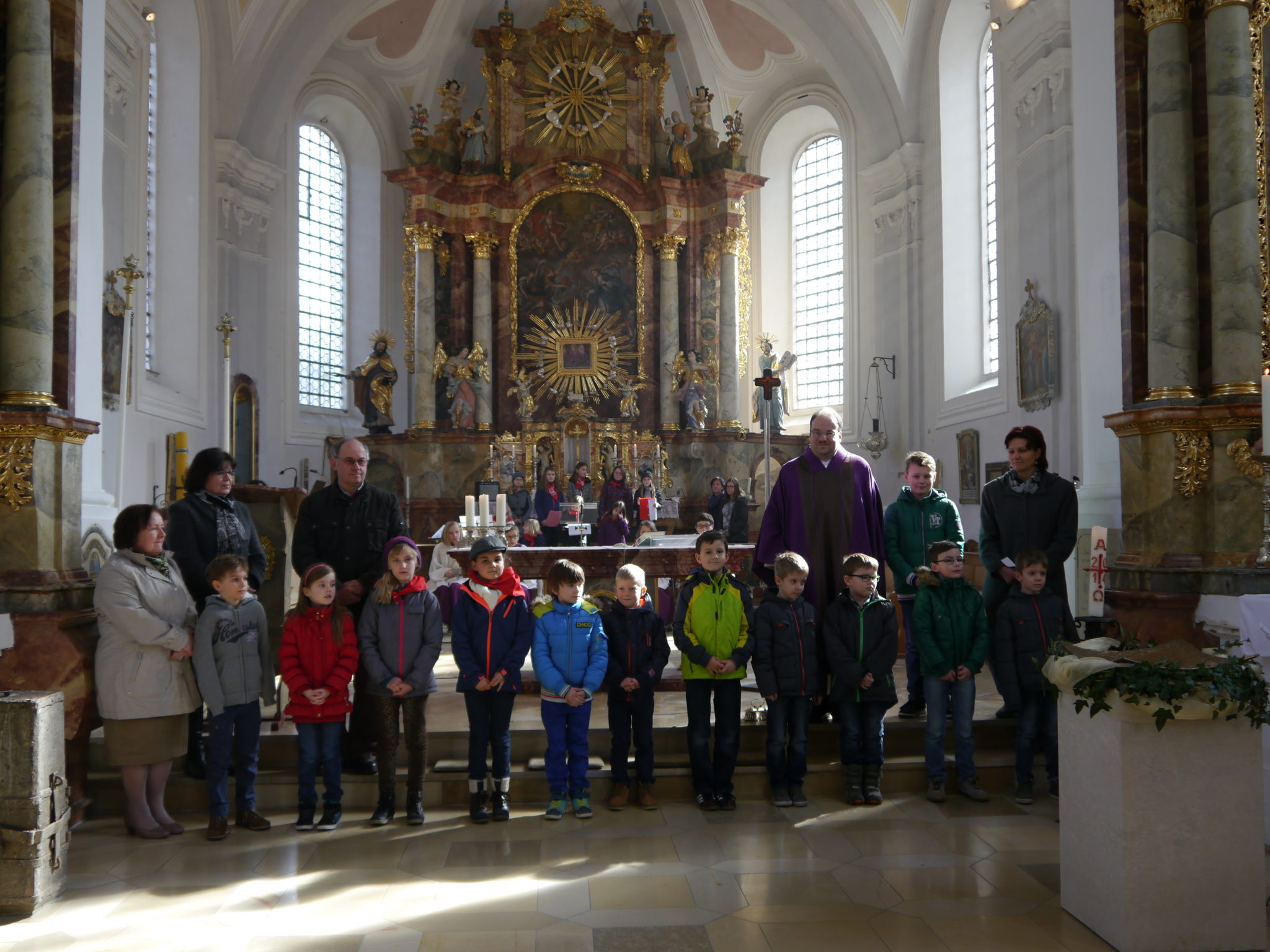 Bei wunderschönem Vorfrühlingswetter, zog Pfarrer Stefan Altschäffel mit den Kindern jeweils in die Kirche ein. Schon im Vorfeld wurden die Kinder durch die Pastoralreferentin Nina Fuchs und der ehemaligen Pfarrgemeinderatssprecherin Annemarie Aschenbrenner auf die Feier vorbereitet.