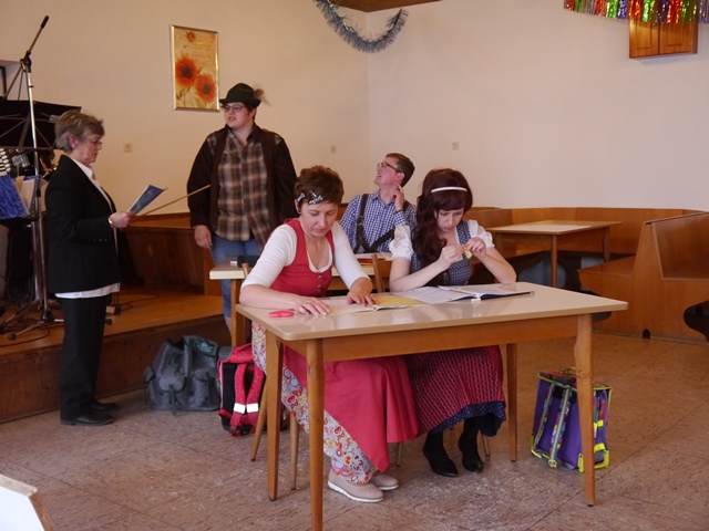 Den ersten Sketch der die Lachmuskeln der Anwesenden schon zu Beginn forderte war der Strenge Lehrer und seine „geplackten“ Schüler. Vorgetragen von Marianne Keimig als Lehrer, mit den Schülern der ersten Reihe Liesl und Susi (Astrid Obermaier u. Maria Weiß) und der zweiten Reihe Seppl und Maxl (Stephanie Dollak und Pfarrer Josef Hausner).