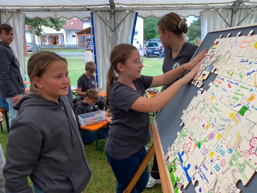 In einigen Vorbereitungstreffen erarbeitete die Gruppe unter der Leitung von Pastoralreferentin Nina Fuchs das ansprechende Konzept. So einigte man sich, dass der Wortgottesdienst von bayerischen Liedern mit religiösem Hintergrund umrahmt wurde. Als gemeinsame Aktion erhielt jeder Gottesdienstbesucher nach der Lesung aus dem Buch Jesaja ein Puzzleteil, welches als Teil der Katechese mit Namen beschriftet wurde sowie den Dingen, welche einen selbst kennzeichnen. Diese Teile fügten die Jugendlichen und „jung Gebliebenen“ zu einem gesamten Puzzle zusammen. Pastoralreferentin Nina Fuchs legte dar, dass alle zusammengehören; anhand des Puzzles werde sichtbar, dass wir eine Gemeinschaft sind; keiner ist allein und einer – Gott – ist immer dabei. Im Anschluss trugen die Jungen und Mädchen der Trachtenjugend sehr persönliche und in bayerischer Sprache selbst formulierte Fürbitten vor. Während des Gottesdienstes gab es auch den einen oder anderen „Gänsehautmoment“, so zum Beispiel als das „Bayerische Halleluja“ miteinander gesungen wurde. Nach dem geistlichen Teil bewirtete die Trachtenjugend die Besucher mit kühlen Getränken und Würstlsemmeln. An vielen positiven Reaktionen merkte man, dass der Gottesdienst gut ankam und sich die Vorbereitungsarbeit gelohnt hatte. Herzlicher Dank gilt den Jungen und Mädchen der Trachtenjugend, welche mit viel Einsatz zum Gelingen des Gottesdienstes beigetragen haben.