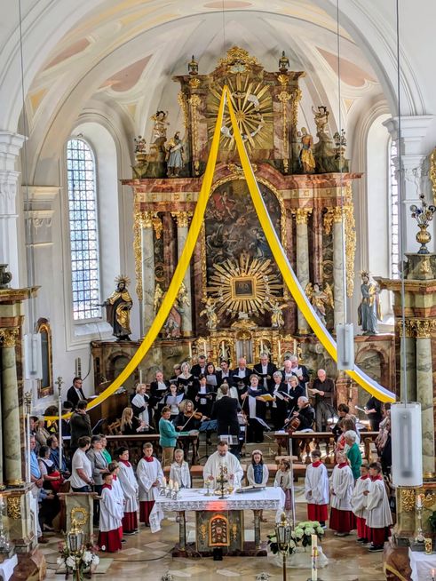 Am Dreifaltigkeitssonntag zelebrierte Pfarrer Dr. Nowak den Festgottesdienst, der mit einer Orchestermesse feierlich umrahmt wurde. Kirchenmusiker Markus Wolf hatte mit dem Chor unserer Pfarrei, der von Sängerinnen und Sängern aus St. Josef, Dingolfing, unterstützt wurde, die Missa Brevis in C-Dur von Wolfgang A. Mozart einstudiert. Streicherinnen und Streicher sowie Kirchenmusiker Marco Heine (St. Johannes, Dingolfing), begleiteten die sehr beeindruckende Aufführung. Pfarrer Dr. Nowak setzte den Schwerpunkt seiner Predigt auf Gott, der ein für uns Menschen ein unbegreifliches Geheimnis ist; wir können immer nur einen Teil von Gott erkennen – Gott immer näher zu kommen, das sei eine lebenslange Herausforderung, ja, eine Lebensaufgabe. Der Glaube an Gott hängt für uns Christen eng mit dem Praktizieren des Glaubens zusammen; in diesem Zusammenhang erzählte Pfarrer Dr. Nowak ein Beispiel aus seinem eigenen Leben: als er vor rund 20 Jahren aus seiner Heimat Polen nach Deutschland kam, konnte er die deutsche Sprache nur so richtig lernen, indem er mit Menschen zusammenkam, mit denen er auch redete; allein durch Aneignung der Theorie kann man keine Sprache lernen; ähnlich verhält es sich auch mit dem Glauben – er muss gelebt werden, in der Gemeinschaft, im Gottesdienst, im Gebet, damit er zu seiner vollen Fülle kommen kann.Pfarrer Dr. Nowak schloss seine Predigt mit dem Text „Das Glück schätzen“, der sich damit befasst, dass man erst etwas richtig schätzen kann, wenn etwas fehlt; der letzte Satz dieses Textes lautet: „Erst im Tod werde ich die alles überragende Bedeutung Gottes erkennen.“ Erst, wenn wir gestorben sind, werden wir Gott in seiner vollen Herrlichkeit schauen. Nach den Dankesworten wurde am Ende des Gottesdienstes in der voll besetzten Dreifaltigkeitskirche das „Te Deum“ angestimmt, ehe man sich das Essen im Wirtshaus schmecken ließ und Gelegenheit hatte, an dem einen oder anderen Verkaufsstand etwas zu erwerben.