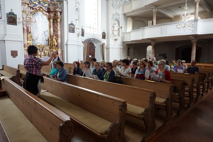 Viel zu schnell verging der Nachmittag, schon stand der Bus bereit, um die Gruppe zum nahe gelegenen „Dom zu Ebbs“ zu bringen. In der herrlichen Barockkirche betätigten sich Paul Weinzierl und Pfarrer Stefan Altschäffel als Kirchenführer, nachdem der dortige Mesner, der dafür vorgesehen war, leider nicht da sein konnte. In dem Kirchenraum, an dessen Decke eindrucksvolle Fresken aus dem Leben der Gottesmutter Maria zu bewundern sind, sangen die Chorsänger unter Leitung von Alexandra Zettl und Gitarrenbegleitung von Pfarrer Stefan Altschäffel das Abendlob. Die Gitarrenbegleitung war anschließend noch einmal gefordert, um die Busfahrt nach Schechen zur abendlichen Brotzeit mit geselligen Unterhaltungsliedern zu verkürzen. Schließlich konnte man auf einen sehr schönen und erfüllten Ausflugstag zurückblicken, der den treuen und aktiven Kirchenmusiker und Chorsänger eine Zeichen der Anerkennung und Wertschätzung der Pfarrei sei, wie Pfarrer Stefan Altschäffel auf der Heimfahrt im Bus bekundete.
