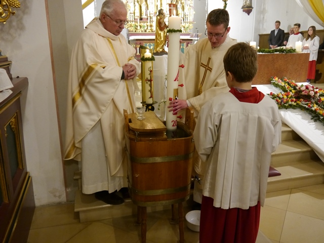 Bei Anbruch der Nacht wurde vor dem Eingang der Kirche das Osterfeuer entfacht, gesegnet und daran die Osterkerze entzündet. An der Kerze wurden fünf Wachsnägel angebracht, zur Erinnerung an den verwundeten und gekreuzigten Christus.