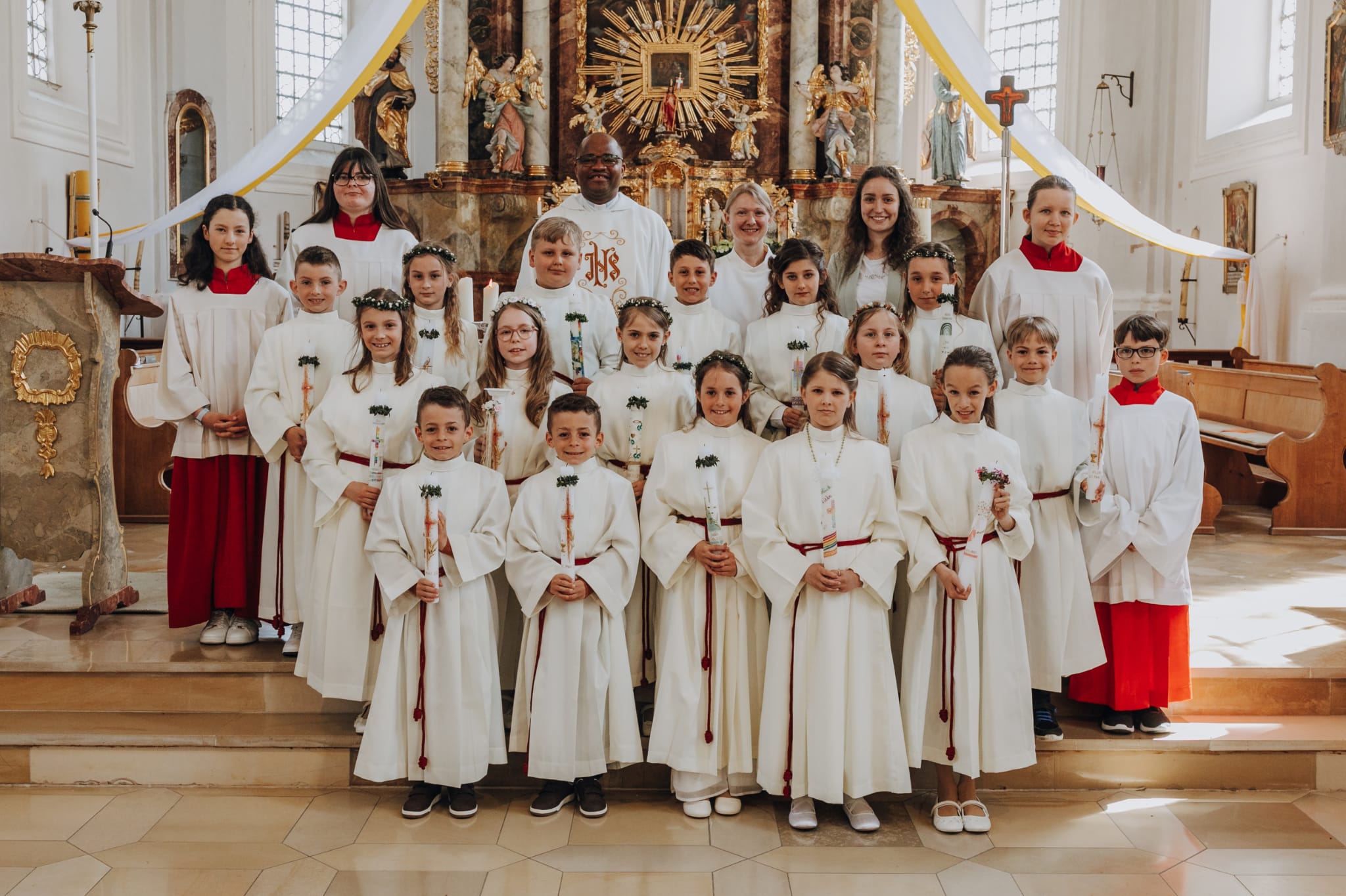 In diesem Jahr gab es in der Pfarreiengemeinschaft ein Erstkommunionnovum: Die Kinder der beiden dritten Klassen der Grundschule Moosthenning feierten gleichzeitig ihre erste Begegnung mit Jesus in der Heiligen Kommunion. In der Pfarrkirche in Ottering zelebrierte Pfarrer Dr. Przemyslaw Nowak den Festgottesdienst, während auf dem Dreifaltigkeitsberg Pfarrvikar Constantin Katelu Kamba die Feier leitete. Insgesamt hatten sich einunddreißig Jungen und Mädchen im Religionsunterricht, in ihren Tischgruppen und bei verschiedenen Pfarreiveranstaltungen auf das Sakrament der Kommunion vorbereitet und freuten sich auf den großen Tag in der Kirche und mit ihren Familien.