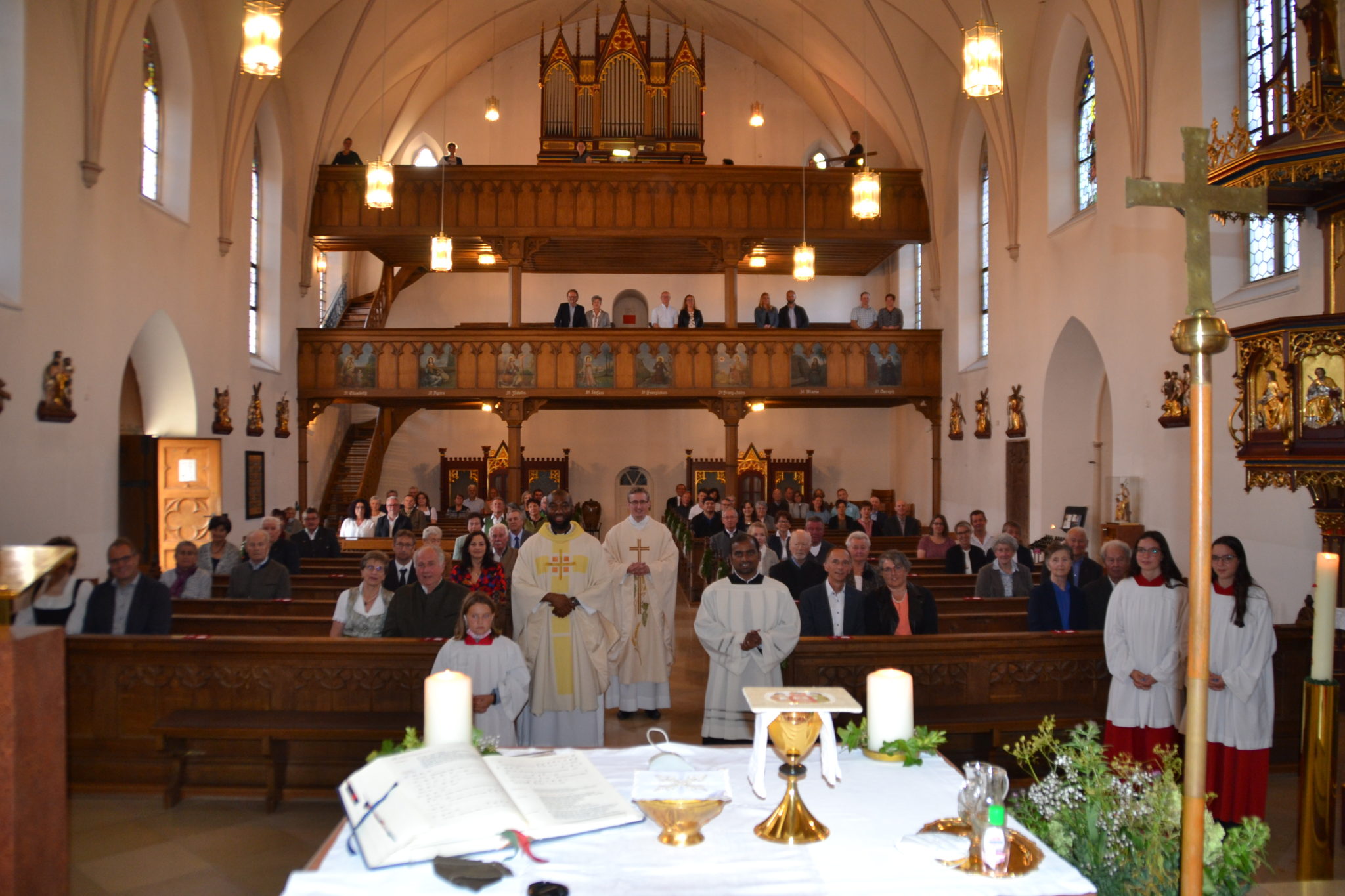 Bei schönstem Spätsommerwetter strömten die Jubelpaare in die Pfarrkirche. Ab dem fünften Hochzeitstag werden die Paare im Fünf-Jahres-Turnus zu dieser besonderen Feier eingeladen, welche jährlich stattfindet. Zelebriert wurde das Heilige Amt von Pfarrer Josef Hausner, Pfarrvikar Bonaventure Ukatu und Seminarist Suresh Babu Kanumuri. Pfarrer Josef Hausner erinnerte die Ehepaare daran, dass jeder Tag uns zahlreiche Entscheidungen abringt. Manche davon haben keine besondere Tragweite, andere erfordern Weitsicht, denn durch Entscheidungen bauen wir unser Leben. „Bei der Hochzeit stand die wichtigste Entscheidung eures Lebens an: Die Entscheidung für einen Menschen. Die Entscheidung für die Liebe.“ Pfarrer Hauser regte an, den dritten im Bunde nicht zu vergessen: Gott. „Denn Gott hat sich schon viel früher für uns entschieden. Er liebt uns und macht uns fähig, Entscheidungen zu treffen.“ Pfarrvikar Bonaventure Ukatu hielt die Predigt und brachte seinen Zuhörern vielerlei interessante Hintergründe und Bräuche aus Nigeria, seinem Heimatland, zum Thema Hochzeit nahe. Er sang für die Ehepaare ein Lied in der Sprache Igbo, welches bei Hochzeiten in Nigeria traditionell gesungen wird. Beim allgemeinen Paarsegen durften sich die Paare in Erinnerung an ihre Hochzeit an den Händen halten, einander zuwenden und den Segen empfangen. Der persönliche Paarsegen sowie das Reichen von Wein an die Jubelpaare konnte in diesem Jahr leider nicht stattfinden. Beim Verlassen der Kirche wurde jedem Paar eine Rose und ein kleines Geschenk überreicht. Für feierliche musikalische Gestaltung sorgten Helena Kollmannsberger mit dem Lengthaler Kirchenchor sowie Markus Wolf an der Orgel. Im Anschluss an den Gottesdienst zogen die Jubelpaare zusammen mit dem Pfarrteam zum gemeinsamen Abendessen ins Gasthaus Huber weiter. Pfarrer Josef Hausner sorgte für Lacher, als er von witzigen und besondere Anekdoten und Situationen erzählte, welche sich bei „seinen“ Hochzeiten zugetragen hatten. Bei guten Gesprächen und regem Erfahrungsaustausch ließen die Gäste den schönen Abend gemeinsam ausklingen.