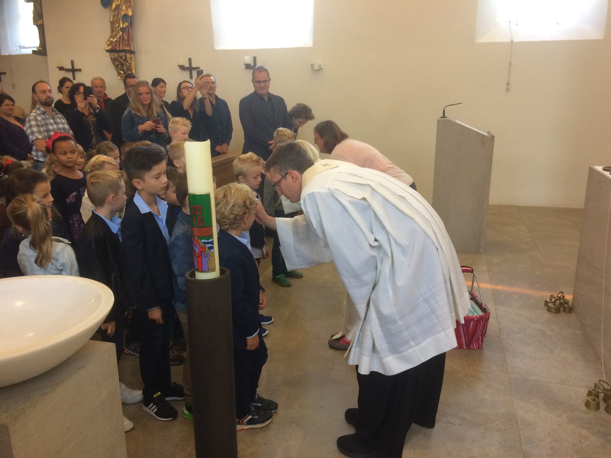 Moosthenning. Für 37 Kinder aus der Gemeinde Moosthenning begann am 11. September die spannendste und lehrreichste Zeit ihres Lebens. Um 8.15 Uhr bekamen die Schulanfänger in der Kirche in Moosthenning den Segen Gottes für ihren neuen Lebensabschnitt. Pfarrer Josef Hausner betonte die Besonderheit des ersten Schultages für jeden Menschen. Er erzählte den Kindern, dass auch Jesus diesen ersten Schultag erlebt hatte. An die Eltern richtete er die Bitte, ihre Kinder mit dem Kreuzzeichen auf der Stirn, in den neuen Schultag zu schicken, als äußerliches Zeichen, dass Jesus in jeder noch so schwierigen Situation bei Ihnen ist. Gemeinsam mit der Pastoralreferentin Melanie Höppler und der evangelischen Reilgionslehrerin Daniela Asael sprach er für jedes Kind den Segen aus. Mit dem Lied „Gottes Liebe ist so wunderbar“ endete die Segensfeier und Pfarrer Hausner entließ die Schulanfänger geradewegs auf ihren Weg zur Schule nach Unterhollerau. Dort wurden sie bereits von den Schülern der zweiten und dritten Jahrgangsstufe erwartet und sie begrüßten die neuen Bären (Schulanfänger in den Flexklassen) mit dem Lied: „Alle Kinder lernen lesen“.