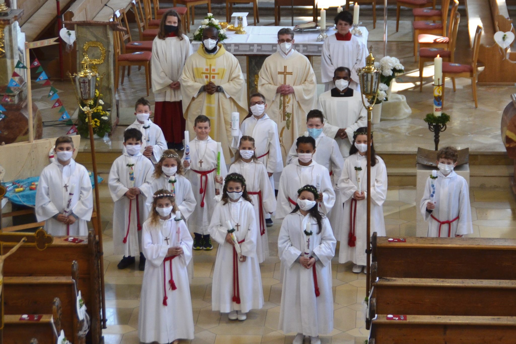 In der Wallfahrtskirche auf dem Dreifaltigkeitsberg empfingen am vergangenen Sonntag 14 Kinder ihre Erste Heilige Kommunion. Pfarrer Josef Hausner, Pfarrvikar Bonaventure Ukatu sowie Pfarrpraktikant Suresh Babu Kanumuri begrüßten die Kinder vor den Toren der Wallfahrtskirche. Dann erfolgte der feierliche Einzug der Kinder mit ihren Kommunionkerzen Kirche. Zu Beginn der Feier erinnerte Pfarrer Josef Hausner daran, dass die 14 Erstkommunionkinder bei ihrer Taufe bereits Gott anvertraut wurden. Damals hatten Eltern und Taufpaten für sie gesprochen. Nach dem Entzünden der Kommunionkerzen an der Osterkerze durften die Kinder dann selbst ihr Taufversprechen erneuern und ihren Glauben bekennen. Auch wenn sich die Kommunionvorbereitung wegen der Corona-Pandemie schwierig gestaltete – Religionsunterricht an der Schule war nur kurz möglich und es konnten keine gemeinsamen Aktivitäten stattfinden – so waren die Kinder durch eigens gedrehte Videoclips von Pfarrer Hausner und den Besuch der Schülergottesdienste auf den Empfang des Sakraments vorbereitet. Das Evangelium nach Matthäus wurde von Pfarrer Josef Hausner in Form einer für Kinder leicht verständlichen Geschichte verkündet. Erzählt wurde von einer Begebenheit, auf die das Motto der diesjährigen Erstkommunionfeier – „Vertrau mir, ich bin da“ – basiert. Jesus tat damals etwas, was eigentlich unmöglich ist: Er wanderte über das Wasser vom See Genezareth. Seine Jünger waren bei stürmischem Wetter völlig verängstigt in einem Boot mitten auf dem Wasser. Als sie eine Gestalt wahrnahmen, welche ihnen auf dem Wasser entgegenging, gerieten sie in Panik, denn sie hielten Jesus für einen Geist. Nachdem Jesus sich zu erkennen gegeben hatte, fasste sein Jünger Petrus Mut, stieg aus dem Boot und wanderte selbst über das Wasser Jesus entgegen. Doch dann kamen ihm Zweifel. Er wusste: Eigentlich kann man nicht auf dem Wasser gehen! Solange er volles Vertrauen gehabt hatte, gelang ihm das eigentlich Unmögliche leicht. Mit seinen Zweifeln jedoch begann er, in das Wasser zu sinken. In Not rief er Jesus um Hilfe an. Dieser rettete Petrus und fragte: Du Kleingläubiger, warum hast Du gezweifelt? Als Jesus mit Petrus an Bord ging, legte sich der Sturm und seine Jünger erkannten: Das ist wahrhaftig Gottes Sohn. Pfarrer Hausner ermutigte die Kinder in seiner Predigt, immer auf Jesus zu vertrauen und aus dieser Freundschaft Selbstvertrauen und Mut zu schöpfen. Denn mit Jesus können wir so viel mehr schaffen, als wir uns vorstellen können. Dann war der feierliche Moment gekommen: Die Kinder durften erstmals die Hostie, das Heilige Sakrament der Kommunion, empfangen. Am Ende des feierlichen Gottesdienstes dankte Pfarrer Josef Hausner unter anderem der Chorleiterin Helena Kollmannsberger, dem Organisten Markus Wolf und den Sängerinnen des Kirchenchors Lengthal welche der Feier mit wunderbarer Musik einen würdigen Rahmen verliehen. Beim Verlassen der Kirche erhielt jedes Kommunionkind eine Lavendelpflanze von Vertretern der örtlichen Obst- und Gartenbauvereine. Am Nachmittag fanden sich die Kommunionkinder zu einer Dankandacht erneut in der Wallfahrtskirche ein. Pfarrer Josef Hausner überreichte den Kindern zur Erinnerung an ihre Kommunion ein Kreuz mit dem Logo des Mottos der diesjährigen Erstkommunion: „Vertrau mir, ich bin da“. Trotz strenger Hygienemaßnahmen durften die Kommunionkinder an diesem Sonntag eine schöne Erstkommunionfeier bei sonnigem Frühlingswetter erleben.