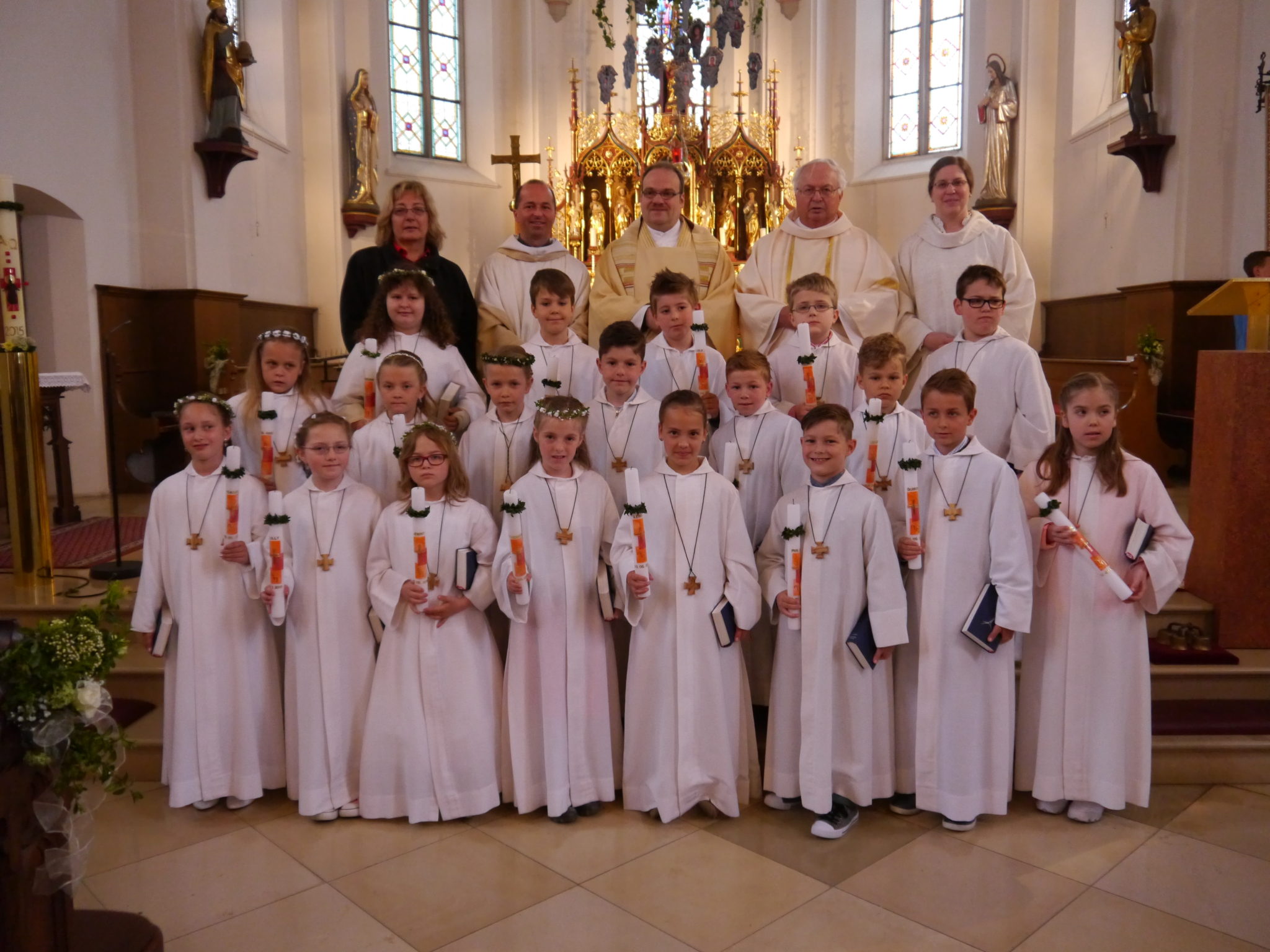 Die Kinder Jenny Apfelbeck, Benedikt Eibauer, Pia Sophie Faltl, Maximilian Forstner, Selina Hasler, Lena Hatzl, Quirin Heidobler, Simon Ismair, Nina Linek, Sabrina Molisch, Lisa Müller, Julian Schindlbeck, Lilly Marlene Schindler, Lukas Schinharl, Philipp Schröttinger, Isabel Stöger, Lukas Tropmann, Christoph Wimmer, Theresa Zurl hatten sich in den vergangenen Wochen und Monaten in der Schule im Religionsunterricht und in den Gruppenstunden auf Ihren besonderen Tag vorbereitet, Jesus zum ersten Mal in Gestalt von Brot und Wein zu empfangen.