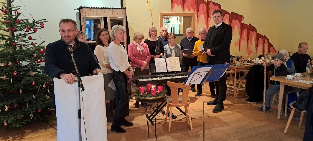 Eröffnet wurde dieser schöne Nachmittag von einer kleinen Flötenmusik mit Anton Schütz und Theo Stuckenberger, die zusammen mit ihrer Lehrerin Carmen Müntzenberg zum ersten Mal in der Öffentlichkeit musizieren durften. Felizia Muchner sprach dazu das Gedicht „Seht die erste Kerze brennt“ während das Lied „Leise rieselt der Schnee“ mit musikalischer Begleitung von Franziska Meindl und dem Violinen Duo Luisa Gangl und Gloria Petzhold die Einleitung abschlossen. In der Begrüßung hieß Pfarrer Przemyslaw Nowak die vielen Senioren der Pfarrei herzlich willkommen. Bei seiner Ansprache, wozu er auch Pfarrvikar Constantin Katelu Kamba, Pastoralreferentin Nina Fuchs, Bürgermeister Anton Kargel und alle Mitwirkenden willkommen hieß, erinnerte der Pfarrer an die Einmaligkeit der kindlichen Adventtage und lud dazu ein, die stade Zeit nicht nur ruhiger anzugehen, sondern die Zeit zu nutzen, um andere einzuladen, die einsam sind. Als Geschenk gäbe es deshalb zwei Teebeutel und Schokolade zum Teilen und Gelegenheit, die Gemeinschaft zu suchen. Hier dankte der Pfarrer Franziska Meindl und Agnes Schöwel für die Organisation des Nachmittags und wünschte den Gästen gute Begegnungen und Gespräche. Als Abrundung dieses Gedankens zur Überwindung von Einsamkeit und Alleinsein, trug Franziska Meindl die Geschichte von den drei Männern „Reichtum- Erfolg und Liebe“ vor, wobei klar wurde, dass nur die Liebe die Möglichkeit für alle Drei ermöglichen kann. Die Herbergsuche und die damit verbundene Aufnahme der Mutter Gottes Figur in den Tagen vor dem Weihnachtsfest deutete Pastoralreferentin Nina Fuchs als Aufforderung, die Türen des Herzens zu öffnen, um die Ankunft Jesu nicht zu versäumen. Symbolisch wurde die Herbergsuche mit der Übergabe und Aussendung der Mutter Gottes Figur an Erna Peter, bei der sie in Lengthal eine erste Nacht beheimatet sein wird, gestartet. Als Abschluss brachte die Mininstrantengruppe zum Lied „Wer klopfet an“ gesungen von Hans Hobmaier, Cornelia Neumeier und Irmgard Roglmeier eine kleine Darstellung der Abweisung durch die Bewohner von Betlehem, ehe der Kirchenchor unter Leitung von Markus Wolf mit dem Lied „Maria durch den Dornwald ging“ den besinnlichen Teil abschloss. Bei Kaffee, Kuchen und kleiner Brotzeit konnten sich die Senioren noch gemütlich unterhalten und mit weihnachtlicher Bläsermusik durch die Müntzenbergs den Nachmittag ausklingen lassen.