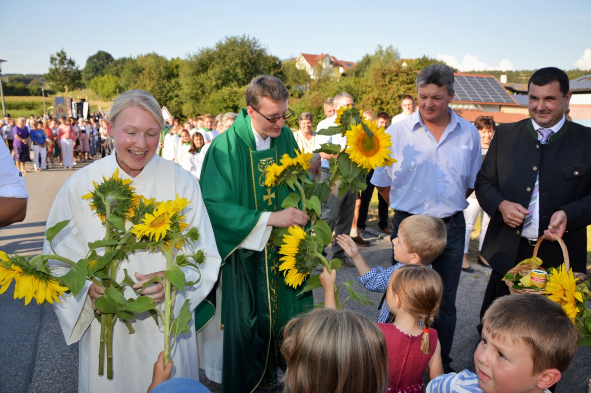 Die Kindergartenkinder begrüßten Pfarrer Hausner und Pastoralreferentin Melanie Höppler mit einem Willkommensgedicht und jedes Kind durfte eine Sonnenblume überreichen. Angeführt von der Blasmusik führte ein Zug in die wunderschön geschmückte Pfarrkirche St. Johannes zum Gottesdienst. Die Frauen vom Pfarrgemeinderat und Elfriede Fischer hatten einen Blumenteppich vor dem Altar vorbereitet.