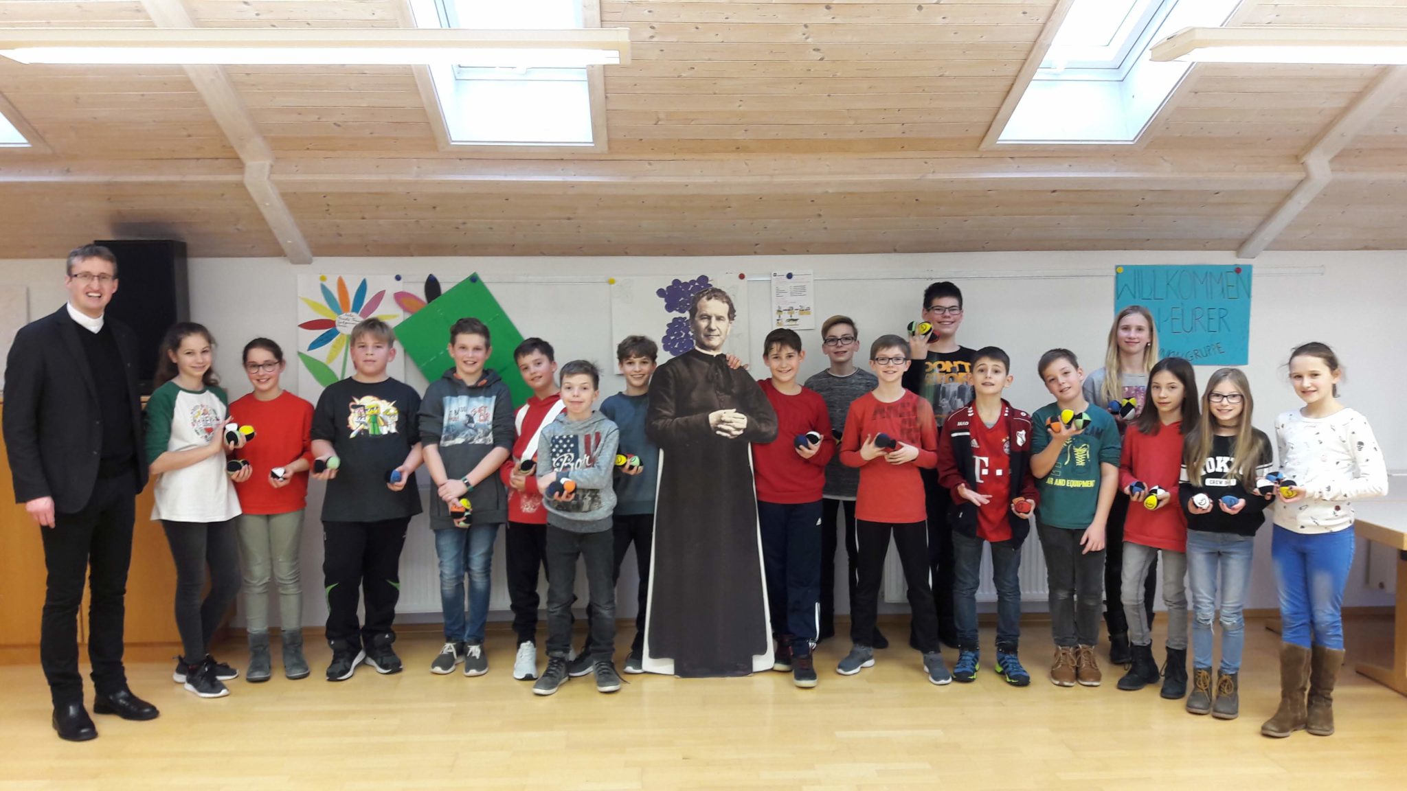 In der Vorbereitung auf die Firmung im Juni nahmen 17 Firmbewerber an der Aktion „Jonglieren lernen von Don Bosco“ teil. Im Pfarrheim in Moosthenning erzählte Pfarrer Josef Hausner anfangs eine Anekdote aus der Jugend des Giovanni Bosco. Darin ging es um die Begeisterungsfähigkeit des späteren Jugendseelsorgers und Heiligen. Giovanni beherrschte Zaubertricks, konnte auf dem Seil tanzen und eben auch jonglieren. Pfarrer Hausner hatte einen Hl. Don Bosco aus Pappe im Gepäck, den er im Pfarrsaal sichtbar aufstellte, und jede Menge Jonglierbälle, mit denen er die Teilnehmerinnen und Teilnehmer versorgte. Unter seiner Anleitung begannen die Jugendlichen zuerst mit einem Ball, dann mit zwei Bällen und letztendlich mit drei Bällen zu jonglieren. Oft mussten sich die Firmlinge bücken, um die Bälle wieder zusammen zu klauben. So mancher Firmling war nach 90 Minuten richtig stolz, dass er das Jonglieren mit drei Bällen ansatzweise schaffte. Alle jedoch hatten sichtlich Spaß und Freude an dieser schweißtreibenden Aktion und nahmen ihre Bälle mit nach Hause. Das Versprechen des Pfarrers hatten sie auf ihrem Nachhauseweg im Hinterkopf: Wer das Jonglieren mit drei Bällen bis zur Firmung kann, bekommt eine Pizza von Pfarrer Hausner. Das dürfte Motivation genug sein, um zuhause „am Ball“, oder besser gesagt „an den Bällen“ zu bleiben.