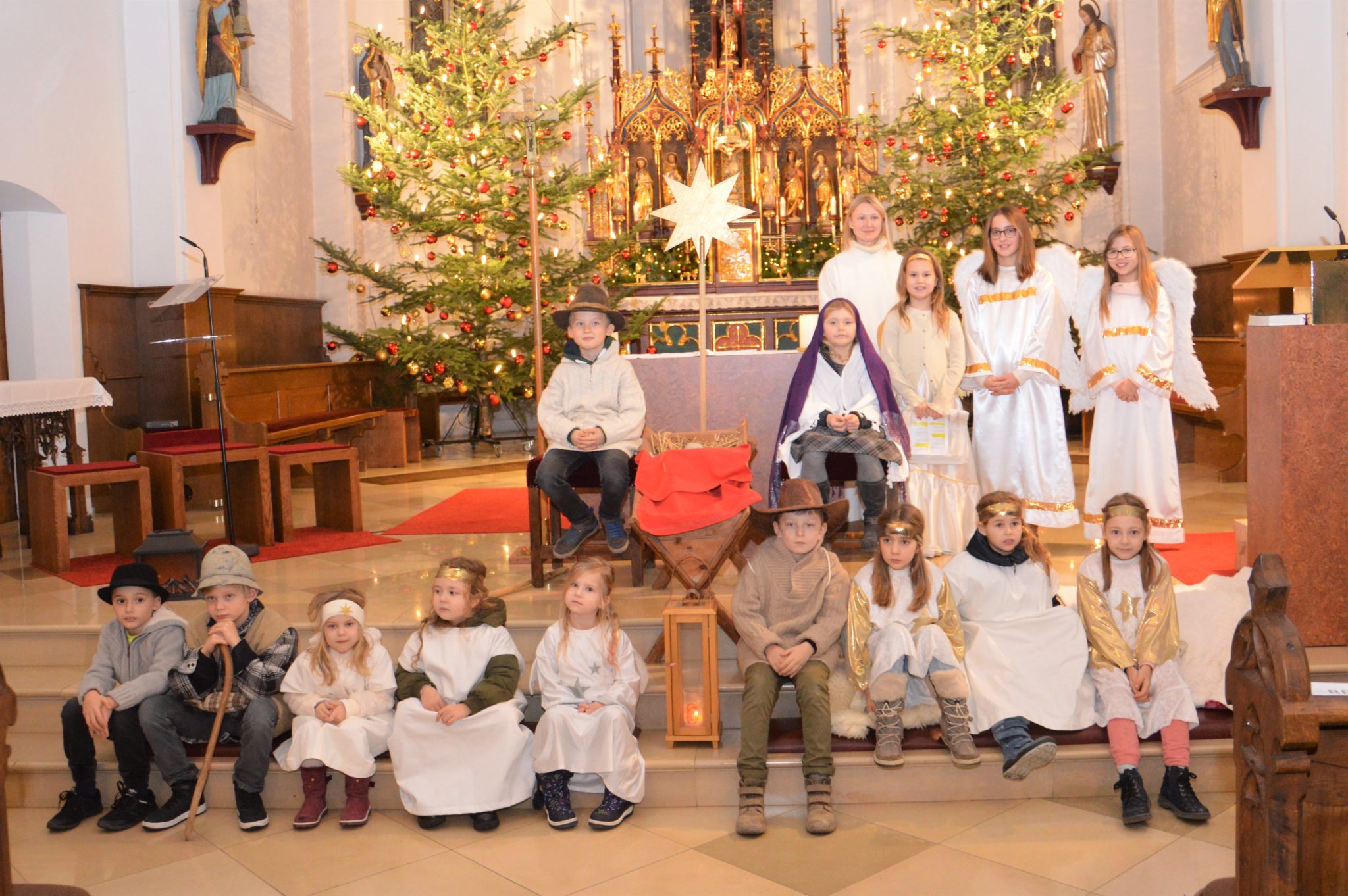 Am Heiligabend um 16 Uhr fanden sich wieder zahlreiche Familien mit Kindern in der Otteringer Pfarrkirche ein um die Krippenfeier mitzuerleben. Zu den weihnachtlichen Orgelklängen von Organistin Helena Kollmannsberger, am Fuße des festlich geschmückten Christbaumes begrüßte Pastoralreferentin Melanie Höppler die Gläubigen und eröffnete den Gottesdienst mit einem Gebet. Alle Anwesenden lauschten gespannt der Weihnachtsgeschichte aus dem Lukasevangelium. Nach dem Evangelium führten einige Erstkommunionkinder, Ministranten sowie mehrere Kindergartenkinder ein von Pastoralreferentin Melanie Höppler geschriebenes Krippenspiel auf. In dem Spiel, das die Kinder mit viel Fleiß einstudiert hatten, wurde auf fantasievolle Weise nachempfunden, wie es Maria und Josef damals im Stall vor Bethlehem ergangen sein könnte. Dabei nahmen nicht nur die Engel, sondern auch ein Zeitreisender aus der Gegenwart eine außergewöhnliche Rolle ein, die den vermeintlich so vertrauten Geschehnissen der Heiligen Nacht eine überraschende neue Perspektive verlieh.