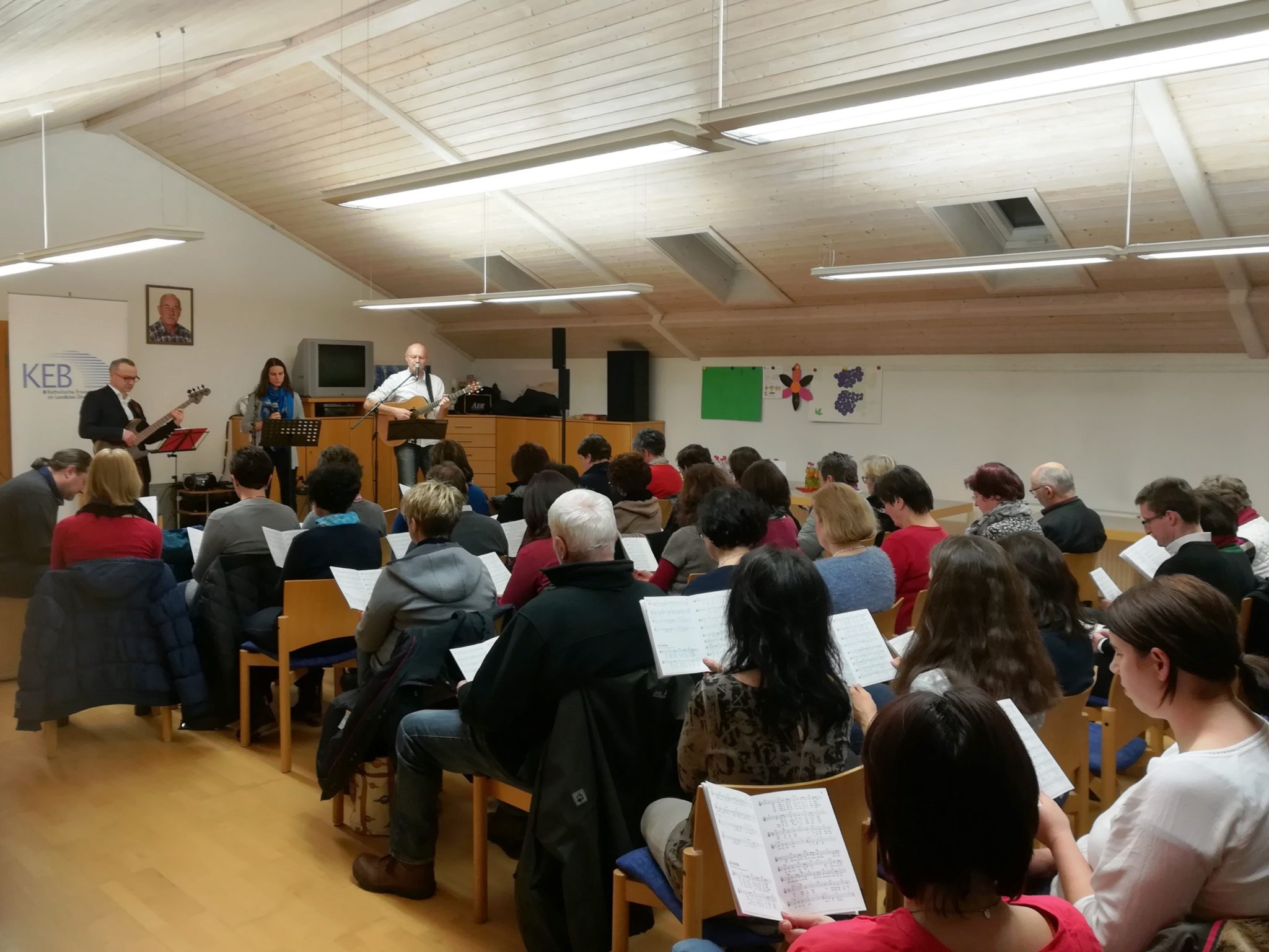 Der Saal war gut gefüllt mit interessierten Sängerinnen und Sängern, denen im Laufe des Abends allerhand geboten wurde. Geschäftsführender Bildungsreferent der KEB Stefan Ramoser begrüßte die Anwesenden eingangs und stellte die „Tankwarte“ vor, welche auf Ihrer Tour Neue Geistliche Lieder vorstellen um die religiöse Musik in unserer Zeit zu fördern und diese den Menschen durch gemeinsames Singen ausgewählter Stücke nahe zu bringen. Die drei Mitglieder von Musica e Vita, Monika Anglhuber (Gesang), Christian Weinzierl (Bass) und Jürgen Zach (Gitarre und Gesang) brauchten dank Ihrer mitreißenden Art nicht lange, bis alle Anwesenden die Lieder mit Elan und Freude mitsingen konnten. Auch Stücke, die anfangs als schwierig empfunden wurden, saßen bald. So wurde „live“ gezeigt, dass es sich lohnt, öfter mal etwas Neues hinsichtlich der musikalischen Gestaltung von Gottesdiensten zu wagen und Zeit in das Einstudieren neuer Lieder zu investieren.