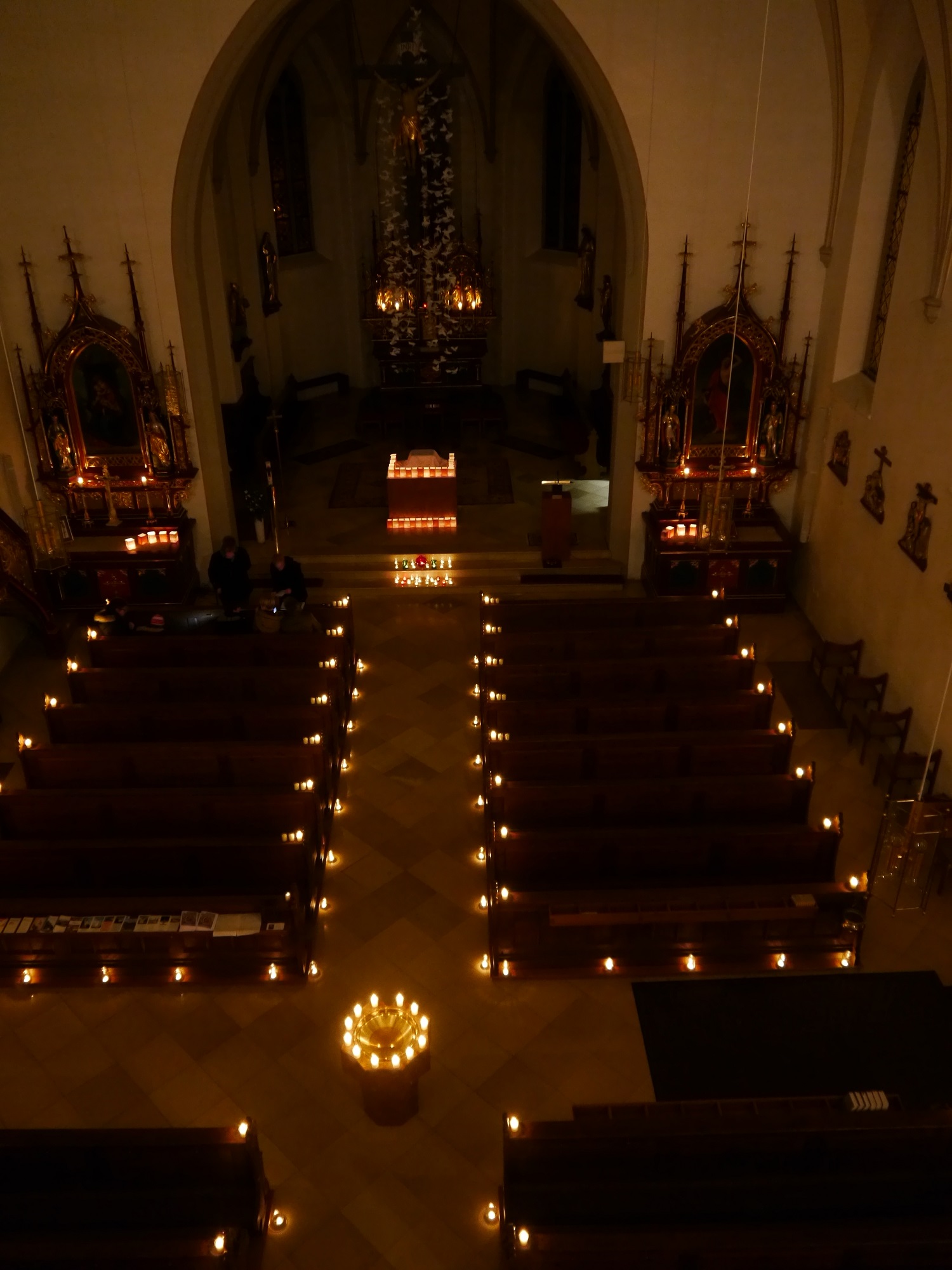 Der Pfarrgemeinderat hatte zuvor die Kirche liebevoll mit den vielen Kerzen geschmückt und die Kirche in ein warmes Licht getaucht, es wurde eine besinnliche Atmosphäre von Ruhe, Anbetung und Lobpreis vor dem Allerheiligsten auf dem Altar geschaffen.