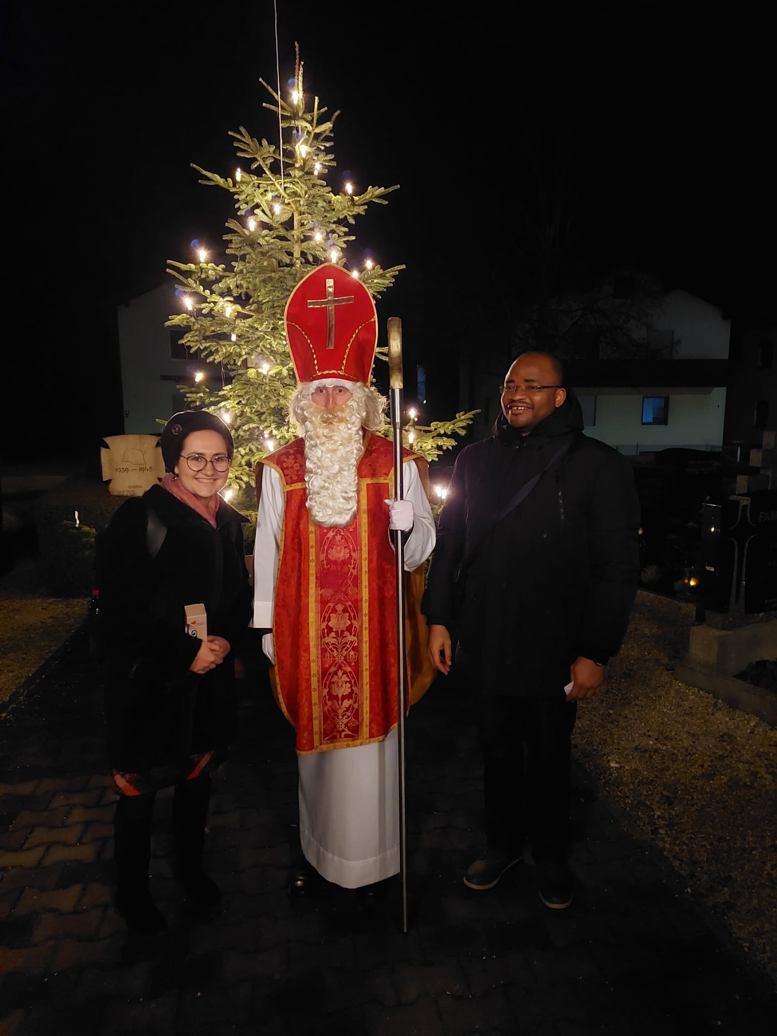 Traditionell wird am 6. Dezember dem Patron der Kirche in Rimbach gedacht, dem Hl. Bischof Nikolaus. Nachdem Pfarrvikar Constantin Katelu Kamba mit den Ministranten im Altarraum Platz genommen hatte, stimmte Kirchenmusikerin Helena Kollmannsberger mit der Orgel ein Nikolauslied an. Nach der Lesung und dem Evangelium trug Lektorin Claudia Maier eine ansprechende Nikolauslegende vor, bei der die Kirchenbesucher so Einiges über den guten Mann erfuhren. Pfarrvikar Constantin berichtete hocherfreut, dass sich bei ihm in Dornwang Bischof Nikolaus telefonisch meldete und seinen Besuch für den Abend in Rimbach ankündigte. Nach der Hl. Messe war es dann so weit. Die Eingangstür wurde geöffnet und Bischof Nikolaus mit Stab und Mitra wartete im Schein der Lichter schon auf die vielen Kinder, um sie zu beschenken. Ein schöner Brauch, der immer großen Anklang findet.