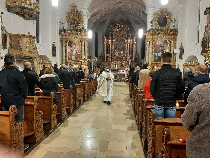 Der bei der Bevölkerung sehr beliebte Pfarrvikar der Pfarrei Ottering Bonaventure Ukatu feierte am Gründonnerstag, Karfreitag und Karsamstag-Abend in Konzelebration mit dem Ruhestandspfarrer Josef Forstner auf dem Dreifaltigkeitsberg zusammen mit den Gläubigen der Ortschaften Lengthal, Dornwang und Rimbach in eindrucksvoller Weise die drei Gottesdienste, die den Höhepunkt des gesamten Kirchenjahres bilden. Der Pfarrvikar wies am Gründonnerstag darauf hin, dass diese drei Tage geprägt sind von Angst, Verzweiflung aber auch großer Freude. Die Angst Jesu auf dem Ölberg am Gründonnerstag und die Verzweiflung der Jünger nach dem Tod Jesu am Karfreitag verwandeln sich in der Osternacht in die pure Freude über die Auferstehung Jesu. Diese Gefühlslage wird durch das Schweigen der Glocken und der Orgel ab dem Gloria der Gründonnerstagsliturgie unterstützt. Einem alten Volksglauben zu Folge fliegen die Glocken nach Rom und kehren erst zum feierlichem Gloria in der Osternacht wieder zurück. Diese drei Gottesdienste wurden musikalisch sehr würdevoll umrahmt. Am Gründonnerstag und Karfreitag durch Organist Markus Wolf und in der Osternacht vom Gemeinschaftschor Lengthal-Dornwang unter der Leitung von Helena Kollmannsberger. Sie sang auch in sehr beeindruckender Weise das „Exsultet“, das als Höhepunkt der Liturgie der Osternacht gilt.